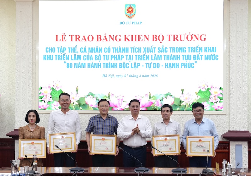 Nhân dịp này, Thứ trưởng Nguyễn Thanh Ngọc đã trao Bằng khen của Bộ trưởng Bộ Tư pháp cho các tập thể, cá nhân, trong đó có tập thể Báo Pháp luật Việt nam đã có thành tích xuất sắc đóng góp trong triển khai Khu triển lãm của Bộ Tư pháp tại Triển lãm thành tựu đất nước “80 năm hành trình Độc lập - Tự do - Hạnh phúc”.