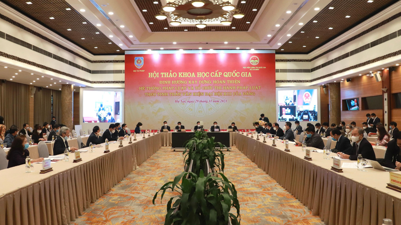 Sáng 29/11, Bộ Tư pháp đã phối hợp với Học viện Chính trị quốc gia Hồ Chí Minh tổ chức Hội thảo Khoa học cấp quốc gia “Định hướng xây dựng, hoàn thiện hệ thống pháp luật và tổ chức thi hành pháp luật theo tinh thần văn kiện Đại hội XIII của Đảng” bằng hình thức trực tuyến tại 03 điểm cầu (Điểm cầu chính tại Trung tâm Hội nghị quốc tế; điểm cầu tại Học viện Chính trị Quốc gia Hồ Chí Minh; điểm cầu tại Bộ Tư pháp).