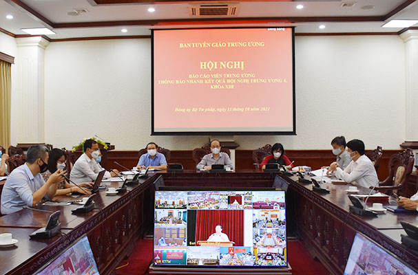 Chiều ngày 11/10, Ban Tuyên giáo Trung ương tổ chức Hội nghị Báo cáo viên Trung ương thông báo nhanh kết quả Hội nghị Trung ương 4 khóa XIII. Chủ trì đồng thời là báo cáo viên Hội nghị là đồng chí Lại Xuân Môn, Ủy viên Ban Chấp hành Trung ương Đảng, Phó Trưởng Ban thường trực Ban Tuyên giáo Trung ương; đồng chí Phan Xuân Thủy, Phó Trưởng Ban Tuyên giáo Trung ương.