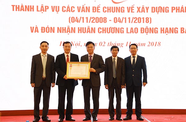 Chiều 2/11, Bộ Tư pháp tổ chức Lễ kỷ niệm 10 năm thành lập Vụ Các vấn đề chung về xây dựng pháp luật (CVĐCVXDPL) (4/11/2008 – 4/11/2018) và đón nhận Huân chương Lao động hạng Ba. Tham dự buổi Lễ có Bộ trưởng Lê Thành Long, nguyên Bộ trưởng Hà Hùng Cường, các Thứ trưởng: Phan Chí Hiếu, Trần Tiến Dũng, Đặng Hoàng Oanh, nguyên Thứ trưởng Đinh Trung Tụng, đại diện lãnh đạo các bộ, ngành, địa phương, lãnh đạo các đơn vị trong và ngoài Bộ cùng đông đủ cán bộ, công chức, người lao động của Vụ CVĐCVXDPL.