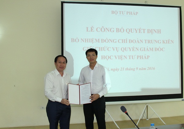 Sáng 21/9, tại trụ sở Học viện Tư pháp, Bộ Tư pháp đã tổ chức Lễ công bố và trao Quyết định số 1956/QĐ-BTP ngày 12 tháng 9 năm 2016 của Bộ trưởng Bộ Tư pháp về việc tiếp nhận và bổ nhiệm đồng chí Đoàn Trung Kiên - Phó Vụ trưởng Vụ tổ chức cán bộ Văn phòng Chính phủ về công tác tại Học viện Tư pháp.
