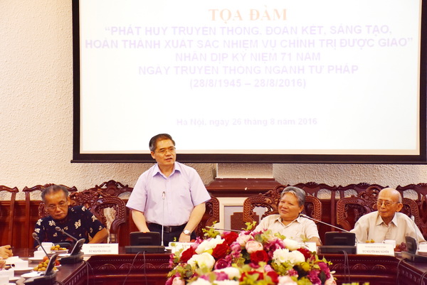 Chiều 26/8, dưới sự chủ trì của Thứ trưởng Đinh Trung Tụng, Bộ Tư pháp tổ chức tọa đàm kỷ niệm 71 năm Ngày truyền thống ngành Tư pháp (28/8/1945 - 28/8/2016) với chủ đề “Phát huy truyền thống, đoàn kết, sáng tạo, hoàn thành xuất sắc nhiệm vụ chính trị được giao”. Tham dự tọa đàm có nguyên Bộ trưởng Nguyễn Đình Lộc, nguyên Bộ trưởng Hà Hùng Cường và các đồng chí nguyên lãnh đạo, đại diện lãnh đạo các đơn vị thuộc Bộ.