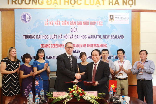 Với mong muốn chia sẻ lợi ích chung trong việc tăng cường trao đổi hợp tác học thuật và nghiên cứu quốc tế, hôm qua (19/7), Trường Đại học (ĐH) Luật Hà Nội và trường ĐH Waikato, New Zealand đã ký kết Biên bản ghi nhớ hợp tác về nghiên cứu khoa học và đào tạo trong các lĩnh vực mà cả hai bên cùng quan tâm. Thứ trưởng Bộ Tư pháp, Hiệu trưởng trường ĐH Luật Hà Nội Lê Tiến Châu tham dự lễ ký kết.