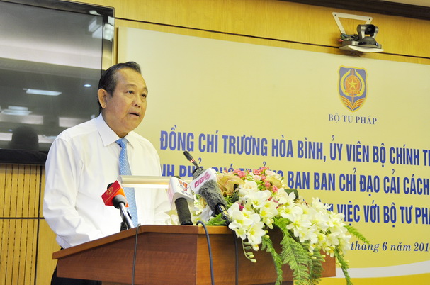 Sáng 16/6, đồng chí Trương Hòa Bình, Ủy viên Bộ Chính trị, Phó Thủ tướng Chính phủ, Phó Trưởng ban Ban Chỉ đạo Cải cách tư pháp Trung ương đã đến thăm và làm việc với Bộ Tư pháp. Một trong những định hướng mà Phó Thủ tướng đề nghị Bộ, ngành Tư pháp phải lưu ý chính là tiếp tục đổi mới tư duy, tạo bước đột phá trong tham mưu, giúp Chính phủ quản lý nhà nước về công tác xây dựng, thi hành pháp luật.