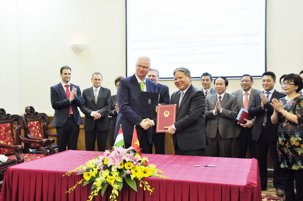 Tối qua (14/3), Bộ trưởng Bộ Tư pháp Hà Hùng Cường cùng các Thứ trưởng Lê Thành Long, Phan Chí Hiếu đã tiếp đón đoàn Bộ Tư pháp Hungary do ngài Bộ trưởng László Trócsányi làm Trưởng đoàn nhân dịp đoàn đến thăm và làm việc tại Việt Nam từ ngày 14 đến 17/03/2016.