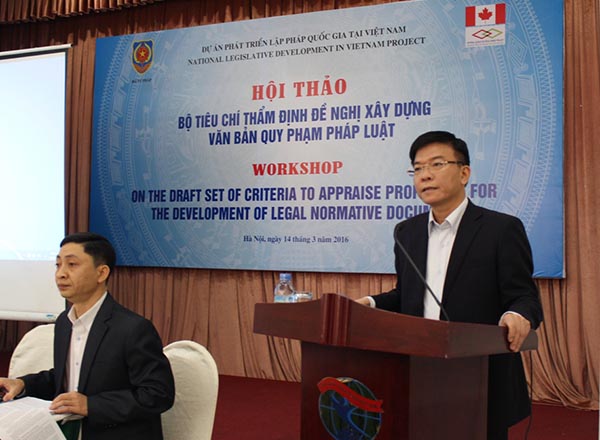 Sáng 14/3, trong khuôn khổ Dự án Phát triển lập pháp quốc gia tại Việt Nam (NLD), dưới sự chủ trì của Thứ trưởng Lê Thành Long, Bộ Tư pháp đã tổ chức Hội thảo “Bộ tiêu chí thẩm định đề nghị xây dựng văn bản quy phạm pháp luật” (hay gọi cách khác là thẩm định chính sách). Đây được coi là công cụ hữu ích cho những người làm công tác văn bản khi giai đoạn phân tích chính sách và giai đoạn soạn thảo văn bản được tách bạch theo quy định của Luật Ban hành văn bản quy phạm pháp luật năm 2015.