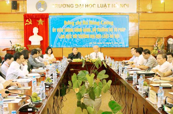 Hôm qua (23/8), Bộ trưởng Bộ Tư pháp Hà Hùng Cường đã có buổi làm việc với Ban Giám hiệu và lãnh đạo chủ chốt Đại học Luật Hà Nội về những nhiệm vụ trọng tâm của Trường trong thời gian tới. Đại học Luật Hà Nội cần tập trung cao nhất cho công tác nâng cao chất lượng đào tạo; tham gia tích cực vào công tác xây dựng pháp luật của Bộ, của đất nước; phối hợp hiệu quả với các trường Trung cấp Luật; tăng cường hiệu quả các chương trình hợp tác quốc tế... là những nhiệm vụ hàng đầu mà Bộ trưởng Hà Hùng Cường yêu cầu Đại học Luật Hà Nội phải thực hiện tốt.
