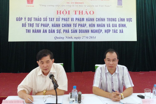 Trong khuôn khổ Dự án “Tăng cường tiếp cận công lý và bảo vệ quyền tại Việt Nam”, ngày 27/6, Tiểu dự án Thanh tra Bộ Tư pháp đã tổ chức Hội thảo “Lấy ý kiến góp ý Sổ tay xử phạt vi phạm hành chính trong lĩnh vực bổ trợ tư pháp, hành chính tư pháp, hôn nhân và gia đình, thi hành án dân sự, phá sản doanh nghiệp, hợp tác xã”. Tham dự Hội thảo có TS. Phạm Quý Tỵ, nguyên Thứ trưởng Bộ Tư pháp, Trưởng nhóm chuyên gia, một số chuyên gia, nhà khoa học pháp lý, đại diện Tòa án nhân dân tối cao, các đơn vị thuộc Bộ Tư pháp, một số Sở Tư pháp và cơ quan thi hành án dân sự các tỉnh phía Bắc.