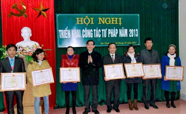 Báo cáo kết quả hoạt động của ngành Tư pháp Hà Tĩnh trong năm 2012, đồng chí Văn Đình Minh - Phó Giám đốc Sở Tư pháp cho biết, năm 2012, công tác tư pháp của tỉnh đã được chủ động triển khai đồng bộ trên mọi lĩnh vực. Nhiều nhiệm vụ công tác đã được hoàn thành đúng tiến độ, đạt kết quả cao như: tổ chức thành công Hội nghị tổng kết Chương trình phổ biến, giáo dục pháp luật của Chính phủ giai đoạn 2008-2012; Tổ chức tổng kết Bộ luật Hình sự và Bộ luật Dân sự; triển khai kịp thời Luật Phổ biến, giáo dục pháp luật; công tác xây dựng, thẩm định, góp ý văn bản QPPL, theo dõi thi hành pháp luật; công tác trợ giúp pháp lý; công tác hành chính tư pháp….