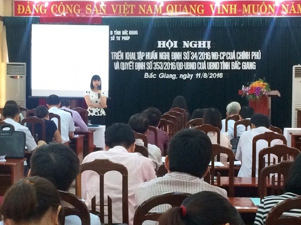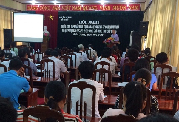 Ngày 11/8/2016, Sở Tư pháp tỉnh Bắc Giang tổ chức Hội nghị triển khai, tập huấn Nghị định số 34/2016/NĐ-CP ngày 14/5/2016 của Chính phủ quy định chi tiết một số điều và biện pháp thi hành Luật Ban hành văn bản quy phạm pháp luật (QPPL) và Quyết định số 353/2016/QĐ-UBND ngày 20/6/2016 của UBND tỉnh ban hành Quy định biện pháp thi hành một số điều của Luật Ban hành văn bản quy phạm pháp luật và chi tiết một số điều của Nghị định số 34/2016/NĐ-CP.