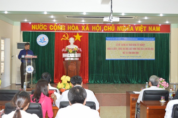 Cũng tại buổi lễ, thay mặt lãnh đạo Sở Tư pháp và Trường Cao đẳng Bình Định, ông Lê Văn Toàn, Giám đốc Sở Tư pháp đã gửi lời cảm ơn đến các thầy cô giáo Trường Đại học Luật Hà Nội đã không ngại khó khăn, xa xôi để tận tình dìu dắt, rèn luyện, giúp đỡ các học viên hoàn thành nhiệm vụ học tập của mình, bổ sung nguồn nhân lực, cán bộ làm công tác pháp luật tại tỉnh Bình Định.