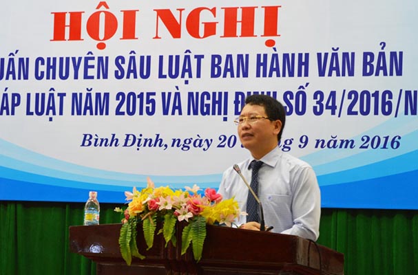 Thực hiện Kế hoạch số 27/KH-STP ngày 31/8/2016 của Sở Tư pháp tỉnh Bình Định tập huấn chuyên sâu Luật ban hành văn bản quy phạm pháp luật năm 2015 và Nghị định số 34/2016/NĐ-CP ngày 14/5/2016 của Chính phủ quy định chi tết một số Điều và biện pháp thi hành Luật ban hành văn bản quy phạm pháp luật năm 2015, ngày 20/9/2016, tại thành phố Quy Nhơn tỉnh Bình Định, Sở Tư pháp tỉnh Bình Định phối hợp với Vụ các vấn đề chung về xây dựng văn bản pháp luật - Bộ Tư pháp tổ chức Hội nghị tập huấn Luật ban hành VBQPPL năm 2015 cho các cơ quan, ban, ngành cấp tỉnh và cấp huyện.