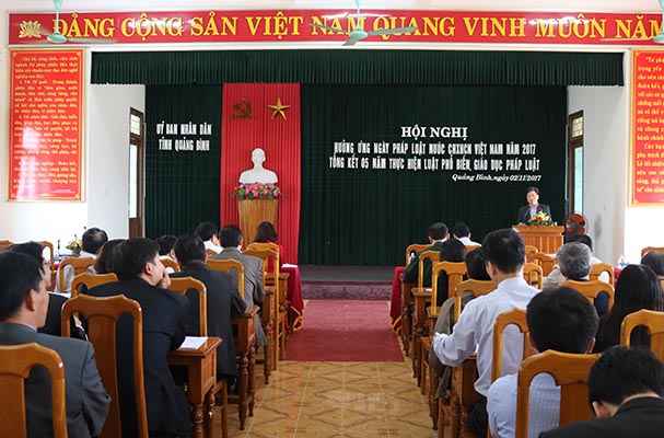 Ngày 02/11/2017, UBND tỉnh Quảng Bình tổ chức Hội nghị hưởng ứng Ngày Pháp luật nước Cộng hòa xã hội chủ nghĩa Việt Nam năm 2017 và tổng kết 05 năm thực hiện Luật Phổ biến giáo dục pháp luật (PBGDPL). Tham dự có đại diện Lãnh đạo các Ban của Tỉnh ủy, Hội đồng nhân dân, Ủy ban Mặt trận Tổ quốc Việt Nam tỉnh, Ban Thi đua khen thưởng tỉnh; đại diện Lãnh đạo các sở, ban, ngành, đoàn thể cấp tỉnh; các cơ quan Trung ương đóng trên địa bàn, các doanh nghiệp Nhà nước, doanh nghiệp có vốn Nhà nước do UBND tỉnh quản lý; báo viên pháp luật cấp tỉnh; đại diện Lãnh đạo HĐND, UBND, UBMTTQVN, Phòng Tư pháp và Chủ tịch Hội Luật gia các các huyện, thị xã, thành phố. Đồng chủ trì hội nghị có đồng chí Nguyễn Tiến Hoàng, TUV, Phó Chủ tịch UBND tỉnh, Chủ tịch Hội đồng Phối hợp PBGDPL tỉnh và đồng chí Nguyễn Thị Lài, TUV, Giám đốc Sở Tư pháp, Phó chủ tịch Hội đồng Phối hợp PBGDPL tỉnh.