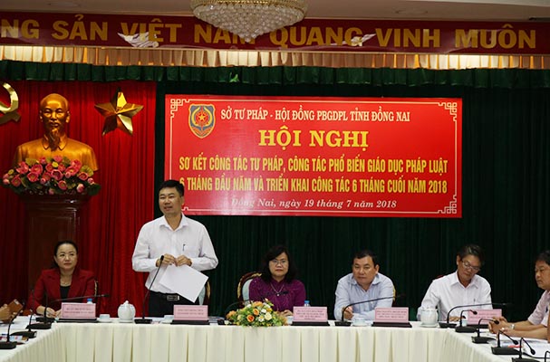 Vừa qua, Sở Tư pháp tỉnh Đồng Nai tổ chức Hội nghị sơ kết công tác tư pháp, công tác phổ biến, giáo dục pháp luật 6 tháng đầu năm 2018, đồng chí Nguyễn Hòa Hiệp – Phó Chủ tịch UBND tỉnh, Chủ tịch Hội đồng phối hợp phổ biến giáo giáo dục pháp luật tỉnh chủ trì Hội nghị. Tham dự Hội nghị có đồng chí Nguyễn Thanh Bình – Cục trưởng Cục Công tác phía Nam (Bộ Tư pháp), đồng chí Viên Hồng Tiến – Giám đốc Sở Tư và các đồng chí lãnh đạo các Sở, ban, ngành, thành viên Hội đồng phối hợp phổ biến, giáo dục pháp luật và Phòng Tư pháp các huyện, thị xã Long Khánh và thành phố Biên Hòa.