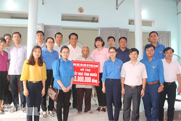 Ngoài hoạt động về nguồn, Sở Tư pháp Hà Nam cũng đã tổ chức trao tặng quà, hỗ trợ xây nhà tình nghĩa cho gia đình ông Trang tại xã Bồ Đề, huyện Bình Lục. Ông Trang năm nay đã gần 90 tuổi, sức khỏe yếu, vợ ông nằm liệt giường từ nhiều năm nay, kinh tế gia đình đặc biệt khó khăn. Vợ chồng ông tuy có 9 người con, nhưng đều thuộc diện gia đình khó khăn. Do đó, mặc dù đã tuổi cao sức yếu nhưng vợ chồng ông vẫn ở trong căn nhà vách đất. Với sự hỗ trợ một phần kinh phí từ Sở Tư pháp, sự chung tay góp sức của chính quyền địa phương, gia đình, ngôi nhà tình nghĩa đã được xây mới kiên cố, khang trang.