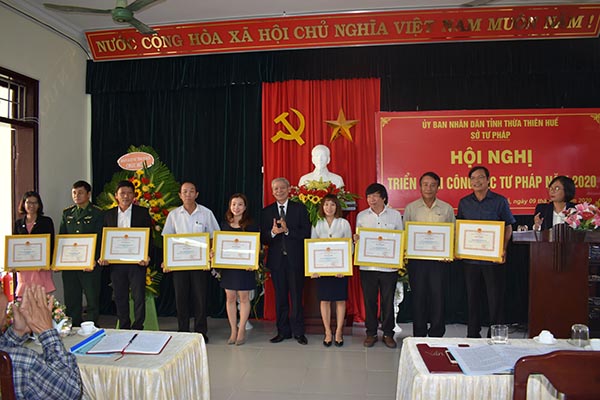 Cũng trong khuôn khổ Hội nghị đã công bố Quyết định tặng Bằng khen của Bộ Tư pháp cho 01 tập thể, 02 cá nhân trong phong trào thi đua chuyên đề năm 2019; tặng Kỷ niệm chương “Vì sự nghiệp Tư pháp” cho 18 cá nhân có đóng góp cho ngành tư pháp; công bố và trao Bằng khen của Chủ tịch Ủy ban nhân dân tỉnh cho 10 tập thể, 09 cá nhân có thành tích trong tổ chức thực hiện Chỉ thị số 32 của Ban Bí thư Trung ương Đảng “Về tăng cường sự lãnh đạo của Đảng trong công tác phổ biến GDPL, nâng bao ý thức chấp hành pháp luật của cán bộ, nhân dân” và Giấy khen của Giám đốc Sở cho 10 tập thể, 10 cá nhân có thành tích trong công tác phổ biến, giáo dục pháp luật năm 2019.