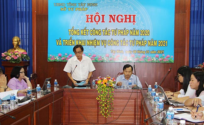 Ngày 08/01/2021, tại Phòng họp trực tuyến của Sở Thông tin và Truyền thông, Sở Tư pháp tỉnh Tây Ninh tổ chức Hội nghị trực tuyến triển khai công tác tư pháp năm 2021. Tham gia Hội nghị, tại điểm cầu cấp tỉnh có Ban Giám đốc Sở Tư pháp và Lãnh đạo các phòng, đơn vị thuộc và trực thuộc Sở; tại điểm cầu cấp huyện có: Đại diện lãnh đạo UBND cấp huyện (phụ trách lĩnh vực Tư pháp); đại diện lãnh đạo Văn phòng HĐND và UBND cấp huyện; cán bộ, công chức Phòng Tư pháp các huyện, thị xã, thành phố; Đại diện lãnh đạo UBND cấp xã (phụ trách lĩnh vực Tư pháp); Công chức Tư pháp - Hộ tịch cấp xã.