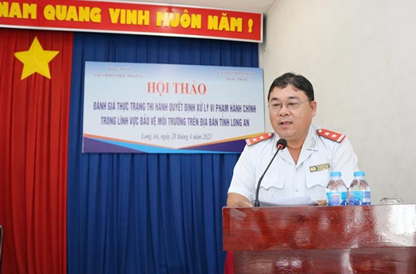 Ngày 28/4/2021, tại tỉnh Long An, Viện Khoa học pháp lý - Bộ Tư pháp phối hợp với Sở Tư pháp Long An tổ chức Hội thảo đánh giá thực trạng thi hành quyết định xử lý vi phạm hành chính (VPHC) trong lĩnh vực bảo vệ môi trường ( BVMT) trên địa bàn tỉnh. Bà Chu Thị Hoa - Phó Viện trưởng Viện Khoa học pháp lý - Bộ Tư pháp, Ông Trần Văn Năm - Phó Giám đốc Sở Tư pháp - chủ trì Hội thảo.