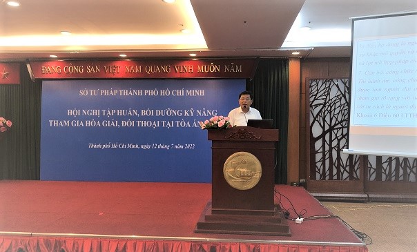 Ngày 12/7, Sở Tư pháp TP. Hồ Chí Minh đã phối hợp với Tòa án nhân dân Thành phố tổ chức Hội nghị tập huấn, bồi dưỡng kỹ năng tham gia hòa giải, đối thoại tại Tòa án trên địa bàn TP. Hồ Chí Minh năm 2022.