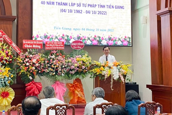 Chiều ngày 04/10, Sở Tư pháp tỉnh Tiền Giang long trọng tổ chức buổi gặp mặt kỷ niệm 40 năm Ngày thành lập Sở Tư pháp tỉnh Tiền Giang (04/10/1982 - 04/10/2022). Đến dự và chúc mừng có các đồng chí: Đồng chí Nguyễn Thanh Bình, Cục trưởng Cục Công tác phía Nam, Bộ Tư pháp; đồng chí Nguyễn Văn Vĩnh, Phó Bí thư Tỉnh ủy, Chủ tịch Ủy ban nhân dân tỉnh; đồng chí Trần Thanh Nguyên, Ủy viên Ban Thường vụ Tỉnh ủy, Phó Chủ tịch Hội đồng nhân dân tỉnh; đồng chí Phạm Văn Trọng, Tỉnh ủy viên, Phó Chủ tịch Ủy ban nhân dân tỉnh; đồng chí Phạm Công Hùng, Giám đốc Sở Tư pháp cùng với các đồng chí là lãnh đạo Sở Tư pháp các tỉnh Long An, Bến Tre, Đồng Tháp và Trà Vinh; lãnh đạo các sở, ban, ngành tỉnh; lãnh đạo Phòng Tư pháp các huyện, thành, thị; các tổ chức bổ trợ tư pháp và các đồng chí nguyên lãnh đạo Sở Tư pháp và toàn thể công chức, viên chức, người lao động của Sở Tư pháp qua các thời kỳ,...