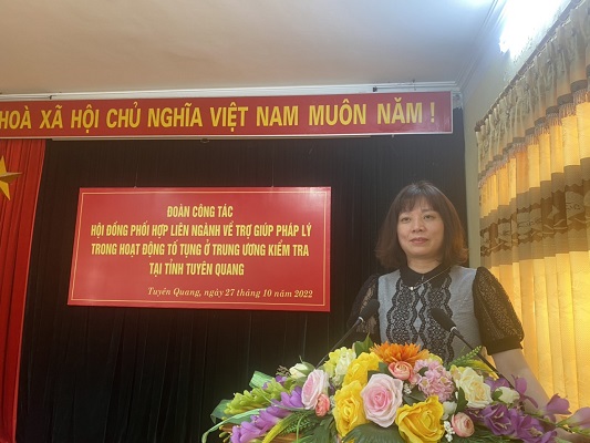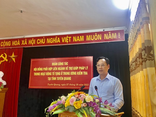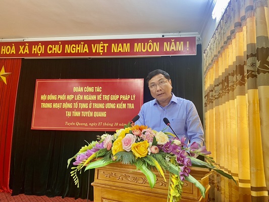 Thực hiện Kế hoạch phối hợp liên ngành về trợ giúp pháp lý (TGPL) trong hoạt động tố tụng Trung ương năm 2022 (ban hành kèm theo Quyết định số 291/QĐ-HĐPH ngày 28/02/2022), ngày 27/10/2022, Đoàn công tác của Hội đồng phối hợp liên ngành (HĐPHLN) về TGPL trong hoạt động tố tụng ở Trung ương do đồng chí Nguyễn Văn Tiến, Phó Chánh án Tòa án nhân dân tối cao làm Trưởng đoàn đã làm việc với HĐPHLN về TGPL trong hoạt động tố tụng tỉnh Tuyên Quang.