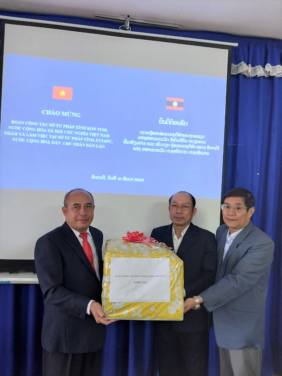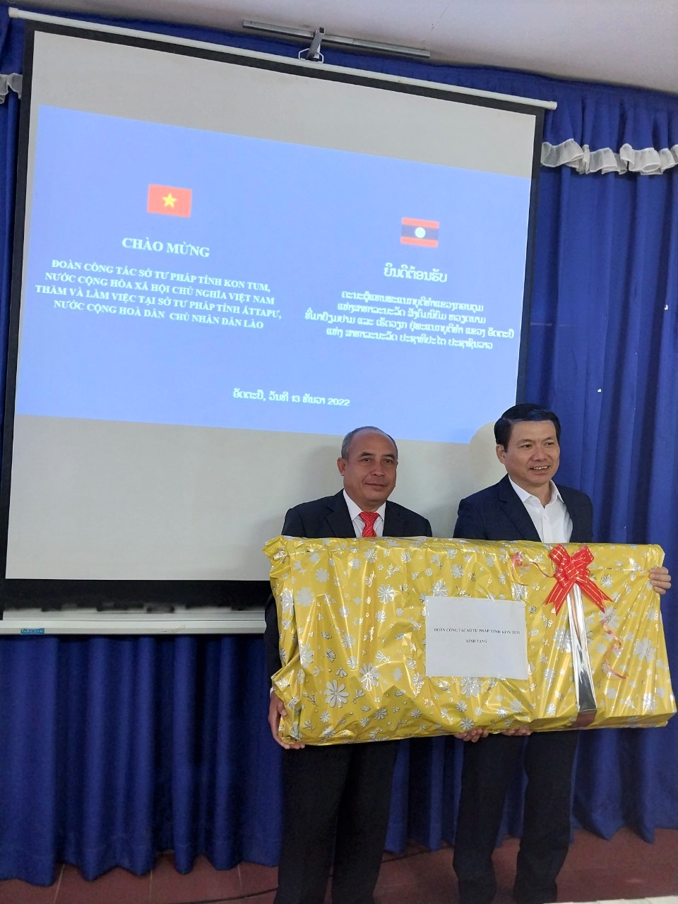Tại chuyến thăm và làm việc, đoàn công tác của Sở Tư pháp tỉnh Kon Tum đã tặng Sở Tư pháp tỉnh Attapu những phần quà hết sức thiết thực và hữu ích phục vụ công tác như máy vi tính để bàn và một số hiện vật khác.