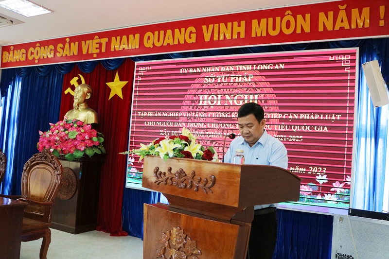Phát biểu tại Hội nghị, đồng chí Trần Văn Năm - Phó Giám đốc Sở Tư pháp nhấn mạnh, Hội nghị nhằm triển  khai  thực  hiện  nghiêm  túc, đầy  đủ, hiệu  quả  Quyết  định  số  25/2021/QĐ-TTg  ngày  22/7/2021  của  Thủ  tướng  Chính  phủ  quy  định  về  xã,  phường, thị trấn đạt chuẩn tiếp cận pháp luật (TCPL); Thông tư số 09/2021/TT-BTP của Bộ Tư pháp hướng dẫn thi hành Quyết định số 25/2021/QĐ-TTg ngày 22/7/2021 của Thủ tướng Chính phủ quy định  về  xã, phường,  thị  trấn  đạt  chuẩn  tiếp  cận  pháp  luật,  gắn  với triển khai thực hiện có hiệu quả tiêu chí TCPL trong thực hiện Chương trình mục tiêu quốc gia xây dựng nông thôn mới giai đoạn 2021 - 2025 trên địa bàn tỉnh; cụ thể tập trung vào nội dung 04 và nội dung 05 - nội dung thành phần số 08 là: tăng cường hiệu quả công tác phổ biến, giáo dục pháp luật (PBGDPL), hoà giải ở cơ sở, giải quyết hoà giải, mâu thuẫn ở khu vực nông thôn; nâng cao nhận thức thông tin về trợ giúp pháp lý (TGPL), tăng cường khả năng thụ hưởng về TGPL.