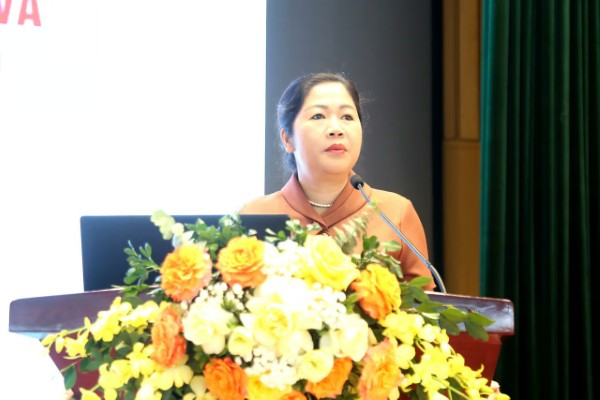 Bà Nguyễn Thanh Hà, Phó Cục trưởng Cục Kiểm tra văn bản và Quản lý xử lý vi phạm hành chính (Bộ Tư pháp) phát biểu tại Hội nghị.