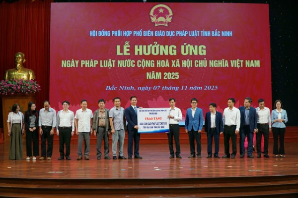 Tại buổi lễ, các đại biểu đã xem phóng sự “Bắc Ninh lan tỏa tinh thần thượng tôn pháp luật”, nghe giới thiệu Demo Trợ lý ảo pháp luật (AI) hỗ trợ cán bộ, công chức trong tra cứu, áp dụng quy định pháp luật; tham gia Cuộc thi trực tuyến “Tìm hiểu pháp luật về hộ tịch” do Sở Tư pháp tổ chức. Dịp này, Hội đồng Phối hợp PBGDPL tỉnh và Sở Tư pháp vận động các doanh nghiệp, tổ chức trao tặng 15 bộ máy vi tính và 4.000 cuốn sách pháp luật cho các xã miền núi, vùng khó khăn, trong đó Tập đoàn Khoa học Kỹ thuật Hồng Hải (Foxconn) tài trợ 10 bộ máy vi tính, phục vụ xây dựng “Tủ sách pháp luật điện tử”.