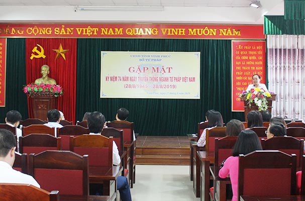 Chiều 27/8, Sở Tư pháp Vĩnh Phúc đã tổ chức gặp mặt Kỷ niệm 74 năm Ngày truyền thống ngành Tư pháp Việt Nam (28/8/1945 - 28/8/2019). Dự buổi gặp mặt có đồng chí Nguyễn Văn Bắc, Tỉnh ủy viên, Giám đốc Sở Tư pháp; đại diện lãnh đạo Cục thi hành án dân sự tỉnh; các đồng chí Phó Giám đốc Sở Tư pháp; các đồng chí nguyên lãnh đạo Sở (đã nghỉ hưu kể từ khi tái lập tỉnh đến nay) cùng toàn thể công chức, viên chức, người lao động thuộc Sở Tư pháp.