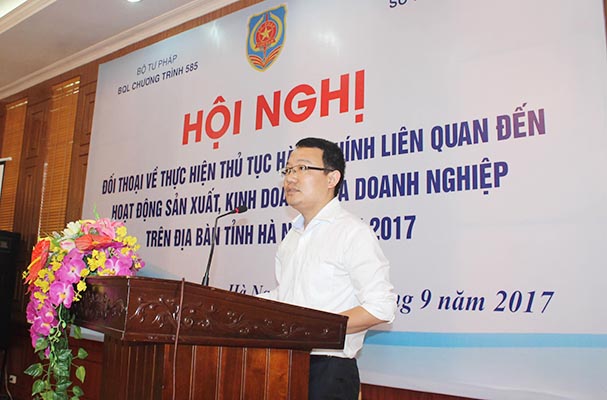 Thực hiện Quyết định số 108/QĐ-BTP của Bộ trưởng Bộ Tư pháp và Kế hoạch số 3232/KH-UBND của Ủy ban nhân dân tỉnh Hà Nam về theo dõi tình hình thi hành pháp luật năm 2017, mà trọng tâm là hỗ trợ doanh nghiệp khởi nghiệp, ngày 06/9/2017 Sở Tư pháp tỉnh Hà Nam đã chủ trì, phối hợp với Ban Quản lý Chương trình 585 và Đảng ủy Khối doanh nghiệp tỉnh tổ chức Hội nghị đối thoại về thực hiện thủ tục hành chính liên quan đến sản xuất, kinh doanh của doanh nghiệp năm 2017.