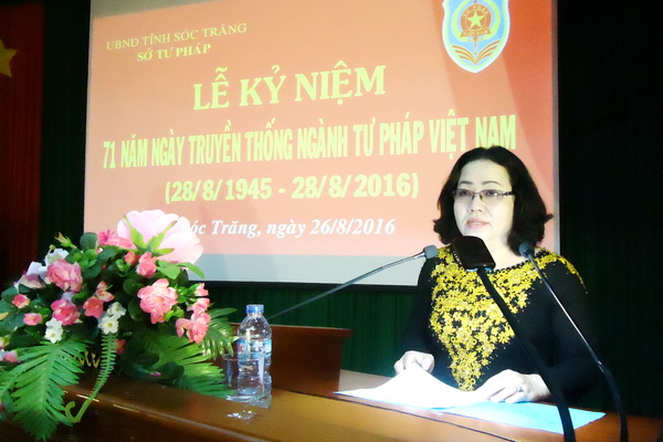 Ngày 26/8, Sở Tư pháp Sóc Trăng đã tổ chức lễ kỷ niệm 71 năm ngày truyền thống ngành Tư pháp Việt Nam (28/8/1945- 28/8/2016). Tham dự có ông Lê Hữu Nghĩa, Ủy viên Ban Thường vụ - Trưởng Ban Nội chính Tỉnh ủy; bà Nguyễn Thị Thu Vân, Tỉnh ủy viên - Giám đốc Sở Tư pháp; đại diện lãnh đạo các Sở, ban ngành; đại diện Ủy ban nhân dân và Phòng Tư pháp các huyện, thị xã, thành phố.