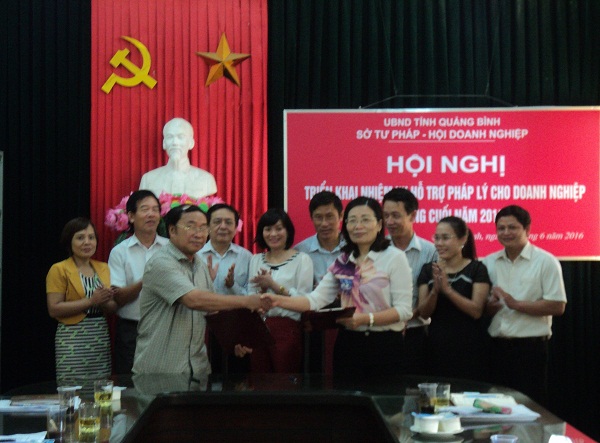 Ngày 30/6/2016, Sở Tư pháp Quảng Bình và Hội Doanh nghiệp tỉnh đã tổ chức Hội nghị triển khai nhiệm vụ hỗ trợ pháp lý cho doanh nghiệp 6 tháng cuối năm 2016. Tham dự Hội nghị, về phía Sở Tư pháp có đồng chí Nguyễn Thị Lài, TUV, Giám đốc Sở, đồng chí Trần Tiến Hải, Phó Giám đốc Sở và đại diện Lãnh đạo Phòng Xây dựng, kiểm tra văn bản quy phạm pháp luật, Phòng Kiểm soát thủ tục hành chính, Phòng Phổ biến giáo dục pháp luật. Về phía Hội doanh nghiệp có đồng chí Trần Hoàng Giang, Chủ tịch Hội doanh nghiệp tỉnh và các đồng chí trong thường trực Hội Doanh nghiệp tỉnh. Hội nghị có sự tham dự của đồng chí Nguyễn Hoài Nam, Phó Giám đốc Sở Kế hoạch và Đầu tư, đại diện Lãnh đạo Phòng Doanh nghiệp và phát triển, Sở Kế hoạch và Đầu tư.