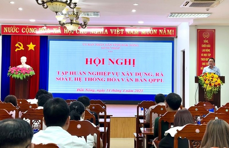 Triển khai Công văn số 969/VPCP-PL của Văn phòng Chính phủ về việc hệ thống hóa văn bản QPPL kỳ 2019-2023, Kế hoạch số 04/KH-UBND của Chủ tịch UBND tỉnh về công tác pháp chế năm 2023 trên địa bàn tỉnh, Kế hoạch số 28/KH-UBND ngày 16/01/2023 của Chủ tịch UBND tỉnh thực hiện hệ thống hoá văn bản quy phạm pháp luật của HĐND, UBND các cấp trên địa bàn tỉnh Đắk Nông kỳ 2019 – 2023; sáng ngày 14/4/2023, Sở Tư pháp Đắk Nông đã tổ chức Hội nghị tập huấn về kỹ năng xây dựng, rà soát, hệ thống hoá văn bản quy phạm pháp luật của HĐND, UBND các cấp trên địa bàn tỉnh kỳ 2019 – 2023.