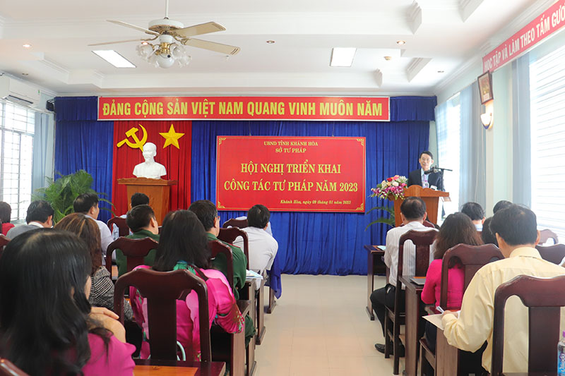 Ngày 09/01/2023, Sở Tư pháp Khánh Hòa long trọng tổ chức Hội nghị triển khai công tác tư pháp năm 2023. Đến dự có đồng chí Đinh Văn Thiệu – Tỉnh ủy viên Phó Chủ tịch UBND tỉnh Khánh Hòa; đồng chí Lý Nguyễn Nguyên Vũ – Tỉnh ủy viện, Giám đốc Sở Tư pháp; các đồng chí Phó Giám đốc Sở Tư pháp; đại diện lãnh đạo các cơ quan thuộc khối Nội chính tỉnh; lãnh đạo Ban Nội chính Tỉnh ủy; đại diện Sở Nội vụ; lãnh đạo phòng Tư pháp cấp huyện cùng công chức, viên chức Sở Tư pháp.