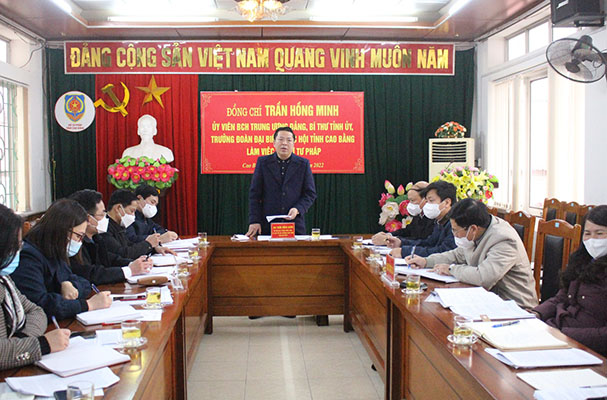 Chiều 21/02/2021, đoàn công tác của tỉnh do đồng chí Trần Hồng Minh, Ủy viên Ban Chấp hành Trung ương Đảng, Bí thư Tỉnh ủy, Trưởng Đoàn đại biểu Quốc hội tỉnh Cao Bằng làm trưởng đoàn làm việc với Sở Tư pháp. Cùng đi có các đồng chí: Hoàng Văn Thạch, Tỉnh ủy viên, Phó Chủ tịch Hội đồng nhân dân tỉnh; Lê Hải Hòa, Tỉnh ủy viên, Phó Chủ tịch Ủy ban nhân dân tỉnh và lãnh đạo một số sở, ngành.