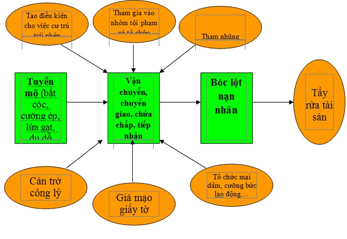 - Mục đích: bóc lột nạn nhân (bóc lột mại dâm hoặc các hành vi bóc lột tình dục khác, các hình thức lao động hay dịch vụ cưỡng bức, nô lệ hay những hình thức tương tự nô lệ, khổ sai hay lấy các bộ phận cơ thể).