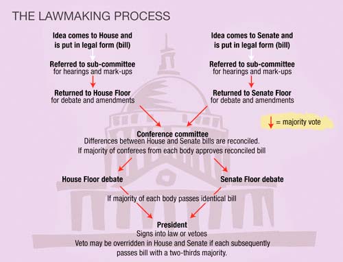 Một dự án luật (do ít nhất một nghị sỹ bảo trợ) muốn được chính thức ban hành thường phải trải qua sự thảo luận, biểu quyết thông qua ở cả Hạ viện và Thượng viện và không bị Tổng thông phủ quyết (veto). Tuy nhiên, từ thời điểm nghị sỹ trình dự thảo luật đến thời điểm dự thảo luật được một viện Quốc hội thông qua là cả một quá trình gian nan. Ít nhất, dự án luật phải trải qua công đoạn nghiên cứu công phu của các ủy ban có liên quan của Quốc hội.