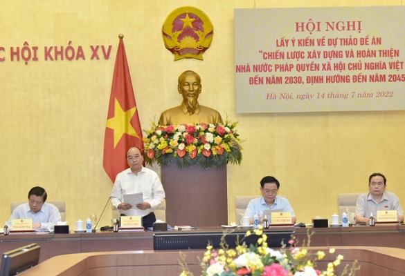 Phát biểu khai mạc Hội nghị, Chủ tịch nước Nguyễn Xuân Phúc vui mừng nhận thấy, thời gian qua, thực hiện sự phân công của Ban Chỉ đạo, Đảng đoàn QH đã triển khai rất nghiêm túc, khẩn trương, trách nhiệm, bài bản, khoa học 4 chuyên đề thuộc Đề án, gồm: Chuyên đề 09 về “Chiến lược xây dựng, hoàn thiện hệ thống pháp luật và tổ chức thi hành pháp luật đến năm 2030, định hướng đến năm 2045 đáp ứng yêu cầu xây dựng, hoàn thiện Nhà nước pháp quyền XHCN Việt Nam”; Chuyên đề 10 về “Hoàn thiện cơ chế phân công, phối hợp và kiểm soát giữa các cơ quan Nhà nước trong việc thực hiện quyền tư pháp và giữa các cơ quan, tổ chức trong hoạt động tư pháp đáp ứng yêu cầu xây dựng, hoàn thiện Nhà nước pháp quyền XHCN Việt Nam”; Chuyên đề 11 về “Đổi mới tổ chức, nâng cao chất lượng hoạt động của QH đáp ứng yêu cầu xây dựng, hoàn thiện Nhà nước pháp quyền XHCN Việt Nam”; Chuyên đề 12 về “Hoàn thiện cơ chế bảo vệ Hiến pháp đáp ứng yêu cầu xây dựng, hoàn thiện Nhà nước pháp quyền XHCN Việt Nam”. Theo Chủ tịch nước, 4 chuyên đề này là nền tảng, có ý nghĩa lớn lao về vai trò của QH trong xây dựng Nhà nước pháp quyền XHCN.