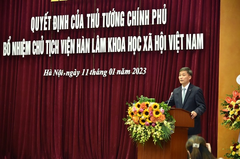 Tân Chủ tịch Viện Hàn lâm Khoa học xã hội Việt Nam Phan Chí Hiếu phát biểu nhận nhiệm vụ.