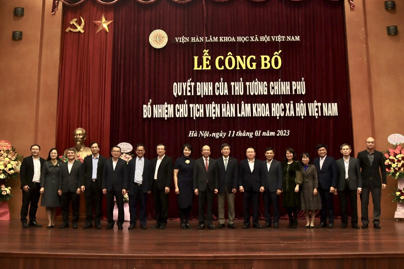 Các đại biểu dự Lễ công bố chụp ảnh lưu niệm cùng tân Chủ tịch Viện Hàn lâm Khoa học xã hội Việt Nam.