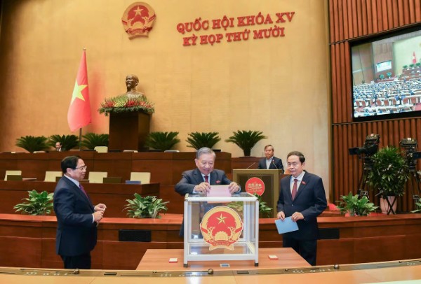 Tổng Bí thư Tô Lâm, Thủ tướng Phạm Minh Chính, Chủ tịch Quốc hội Trần Thanh Mẫn bỏ phiếu. (Ảnh: quochoi.vn)