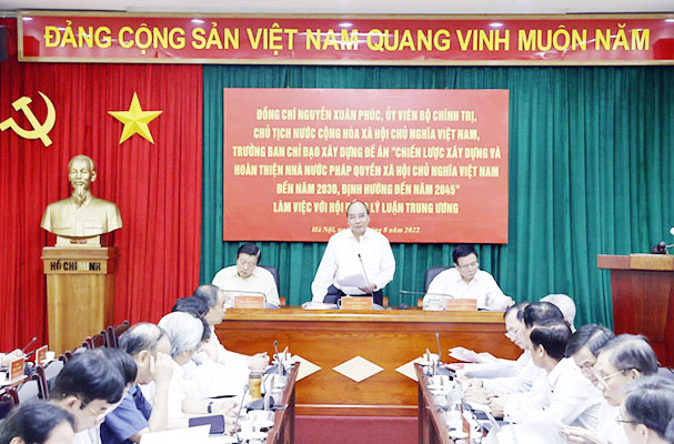 Ngày 11/8, tại Trụ sở Hội đồng Lý luận Trung ương, Ủy viên Bộ Chính trị, Chủ tịch nước Nguyễn Xuân Phúc, Trưởng Ban Chỉ đạo xây dựng Đề án “Chiến lược xây dựng và hoàn thiện Nhà nước pháp quyền xã hội chủ nghĩa Việt Nam đến năm 2030, định hướng đến năm 2045” đã chủ trì buổi làm việc của Thường trực Ban Chỉ đạo với Hội đồng Lý luận Trung ương.