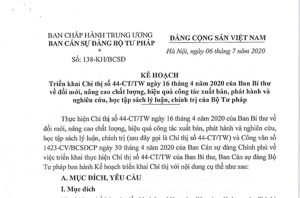 Ngày 06/7/2020, Bí thư Ban Cán sự đảng Bộ Tư pháp, Bộ trưởng Bộ Tư pháp Lê Thành Long đã ban hành Kế hoạch số 138-KH/BCSĐ về việc triển khai Chỉ thị số 44-CT/TW ngày 16/4/2020 của Ban Bí thư về đổi mới, nâng cao chất lượng, hiệu quả công tác xuất bản, phát hành và nghiên cứu, học tập sách lý luận, chính trị của Bộ Tư pháp. Theo đó, Kế hoạch triển khai toàn diện các nội dung của Chỉ thị về nâng cao chất lượng, hiệu quả công tác xuất bản, phát hành và nghiên cứu, học tập sách lý luận, chính trị tại Bộ Tư pháp, tạo sự chuyển biến mạnh mẽ về nhận thức của các cấp ủy, tổ chức đảng, cán bộ, đảng viên, công chức, viên chức và người lao động về vai trò, ý nghĩa, tầm quan trọng của sách lý luận, chính trị và nghiên cứu, học tập sách lý luận, chính trị, góp phần nâng cao năng lực, trình độ của đội ngũ cán bộ, đảng viên của Bộ, ngành Tư pháp, đáp ứng yêu cầu xây dựng Nhà nước pháp quyền xã hội chủ nghĩa.