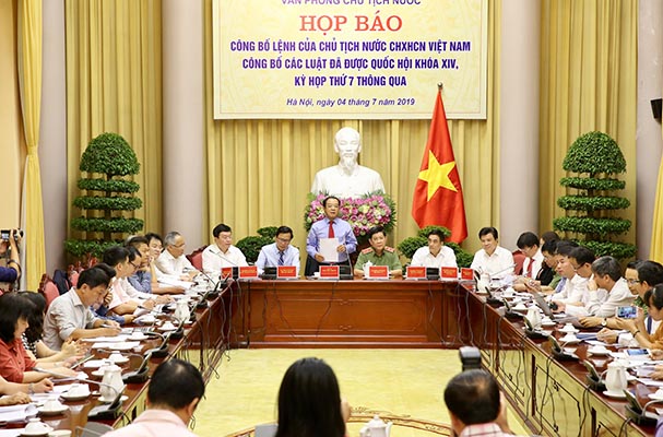 Sáng 4/7, Văn phòng Chủ tịch nước tổ chức họp báo công bố Lệnh của Chủ tịch nước công bố các luật đã được Quốc hội khóa XIV thông qua tại Kỳ họp thứ bảy. Ủy viên Trung ương Đảng, Chủ nhiệm Văn phòng Chủ tịch nước Đào Việt Trung chủ trì và điều hành cuộc họp.