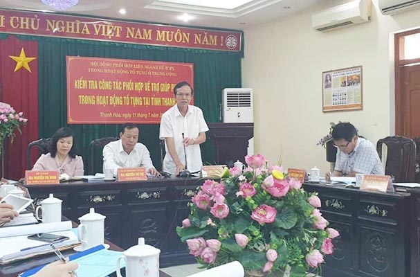 Thực hiện Kế hoạch phối hợp liên ngành về trợ giúp pháp lý trong hoạt động tố tụng năm 2019 (ban hành kèm theo Quyết định 3150/QĐ-HĐPH ngày 28/12/2018 của Hội đồng phối hợp liên ngành về trợ giúp pháp lý trong hoạt động tố tụng ở Trung ương), trong hai ngày 11 và 12/7/2019, Hội đồng phối hợp liên ngành về trợ giúp pháp lý trong hoạt động tố tụng ở Trung ương tổ chức Đoàn kiểm tra liên ngành về công tác phối hợp trợ giúp pháp lý trong hoạt động tố tụng tại hai tỉnh Thanh Hóa và Nghệ An (Đoàn kiểm tra).
