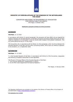 Ngày 13/1/2026, Bộ Ngoại giao Vương quốc Hà Lan có thông báo chính thức về việc Việt Nam đã nộp Văn kiện gia nhập Công ước La Hay năm 1961 về miễn hợp pháp hóa đối với giấy tờ công của nước ngoài (Công ước Apostille) vào ngày 31/12/2025.